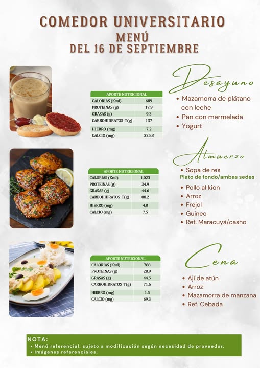 MENÚ DEL DÍA: La Unidad de Servicios Alimentarios, informa el servicio de Comedor Universitario para el 𝗱𝗶𝗮 16 𝗱𝗲 𝘀𝗲𝗽𝘁𝗶𝗲𝗺𝗯𝗿𝗲.
